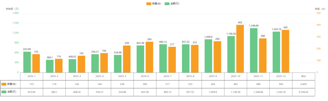 2025年全年累计实现 销售额9,766.62万元,总销量 2,829台