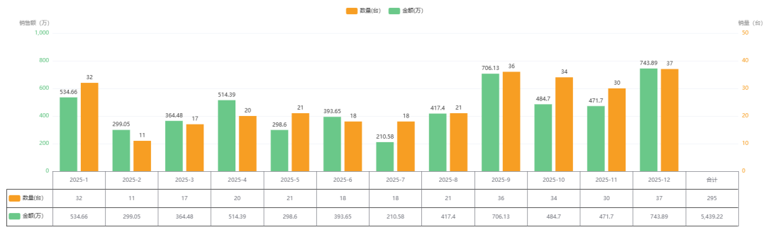 2025年全年累计实现 销售额5,439.22万元,总销量 295台
