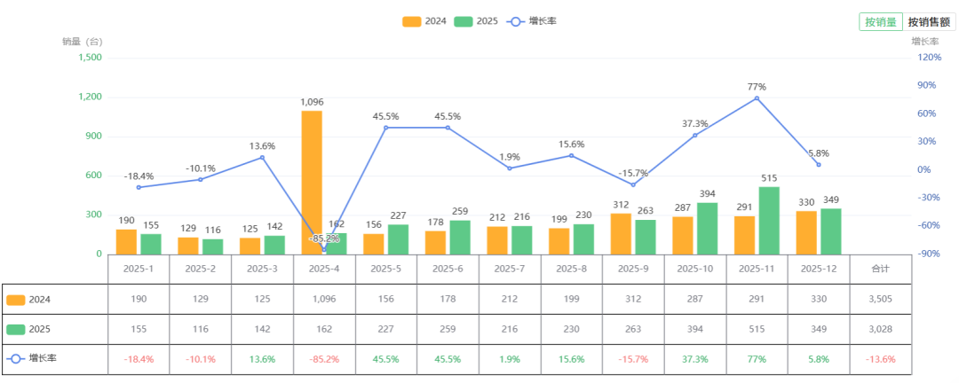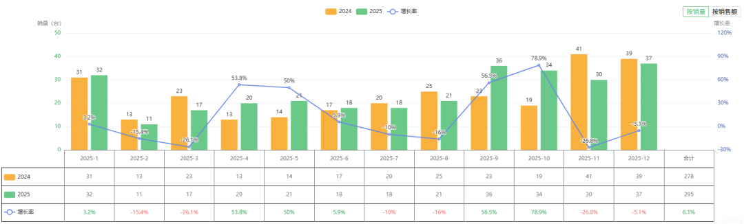 量增价跌:尽管四季度平均单价降至全年最低的16.83万元,但高销量弥补了价格下探带来的损失。12月份单月销量达到37台,销售额743.89万元,双双登顶,展现出极强的市场爆发力和年底集中采购的强劲需求。