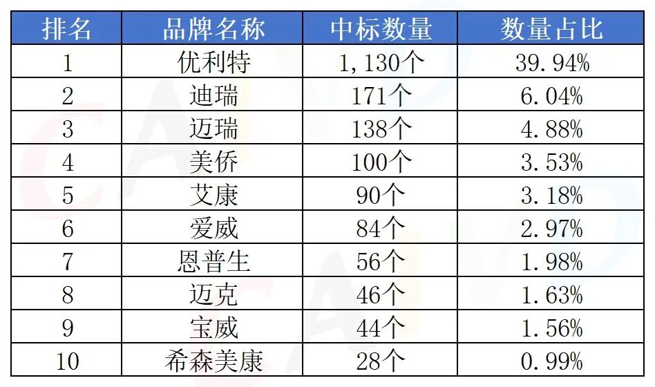 按照中标数量排名前三的是:优利特中标数量1,130个,占比39.9%;迪瑞中标数量171个,占比6.04%迈瑞中标数量138个,占比4.88%。