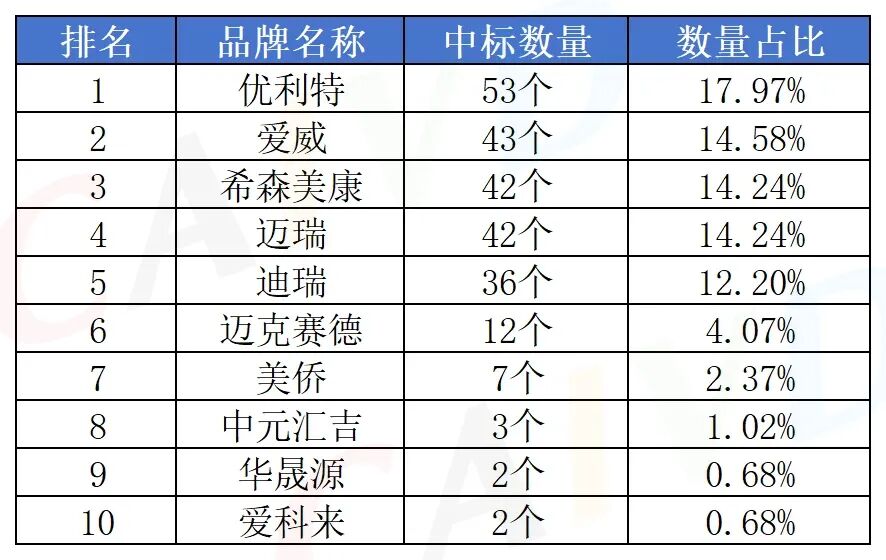 按照中标数量排名前三的是:优利特中标数量53个,占比:17.97%;爱威中标数量43个,占比14.58%希森美康中标数量42个占比14.24%