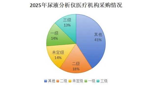 2025年,在尿液分析仪的采购中,其他医疗机构,占比最高,为41.16%;二级医疗机构,占比18%;一级级医疗机构、未定级医疗机构占比14%;三级级医疗机构,占比13%