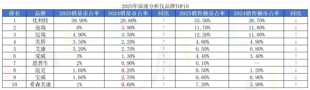 按照2025年销量市场占有率排名前三的是:优利特销量市场占有率39.9%,迪瑞销量市场占有率6%,迈瑞销量市场占有率4.90%2025年尿液分析市场呈现深度洗牌:头部品牌优势持续扩大,市场高度集中;同时,国产新势力通过高性价比策略实现份额飙升,猛烈冲击原有格局。伴随销量增长,普遍的价格竞争导至行业“增收不增利”,标志着市场已完全进入以价格战和份额抢夺为核心的存量博弈阶段。
