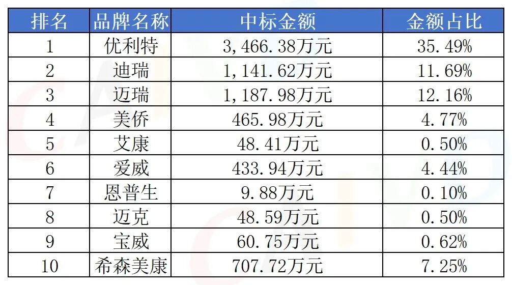 按照中标金额排名前三的是:优利特中标金额3,466.38万元,占比35.49%;迪瑞中标金额1,141.62万元,占比11.69%迈瑞中标金额1,187.98个,占比12.16%。