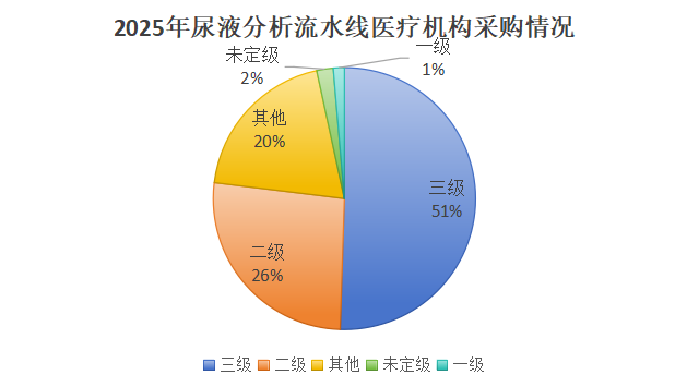 2025年,在尿液分析流水线的采购中,三级医疗机构,占比最高,为51%;二级医疗机构,占比26%;其他医疗机构,占比20%;未定级医疗机构,占比2%;一级医疗机构,占比1%。