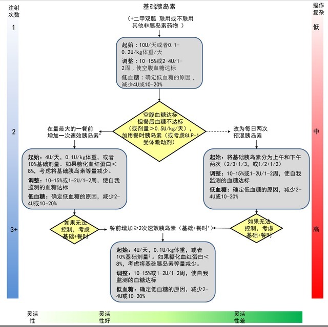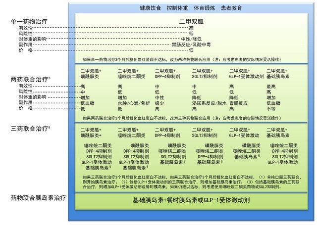 | 随着降糖药物种类越来越多,临床医生在药物的选择和使用方面存在着诸多问题。为此,美国糖尿病学会(ADA)和欧洲糖尿病研究学会(EASD)再次召集了专家进行讨论,更新了 2012 年发布的降糖策略推荐意见。 此次 ADA 与 EASD 联合发布的 2015 年 2 型糖尿病管理指南、降糖策略于本月发表在 Diabetes Care 杂志上,概要如下。 血糖目标 1. 血糖控制是 2 型糖尿病管理的重中之重,但其应与其他降低心血管风险的方案同时进行,包括戒烟等健康的生活方式、血压控制、血脂管理及某些情况下抗血小板治疗等个体化治疗。 2. 糖化血红蛋白(HbA1c)一般目标为 7%,但应根据患者情况进行个体化处理。 应采取更严格控糖目标的一些情况:低血糖及其他药物不良反应风险较低、病程短、预期寿命长、无严重共患疾病、无血管并发症、治疗态度积极及医疗资源充分等。反之,建议采取较宽松的控糖目标。 药物选择 1. 钠 - 葡萄糖协同转运蛋白 2(SGLT2)抑制剂 此次立场声明中药物选择部分与 2012 年版的最大不同就是 SGLT2 抑制剂的引入。 这类药物可使 HbA1c 降低 0.5%-1.0%。与大多数标准口服降糖药相比,SGLT2 抑制剂也表现出相似的降糖作用。值得一提的是, SGLT2 的降糖作用不依赖胰岛素,因此这类药物可应用于 2 型糖尿病的任何阶段,甚至在胰岛素分泌功能已经严重衰退后。此外,SGLT2 的益处还包括适度的减重及稳定的降血压作用。 2. 噻唑烷二酮类(TZDs) 之前一直认为 TZDs 尤其是吡格列酮与膀胱癌的发生有关,欣喜的是,越来越多新证据减少了这种担忧。但这类药物易致体重增加和周围性水肿,并有增加心衰发生率、骨折发生风险。 3. 二肽基肽酶 4(DPP-4)抑制剂 一项大型研究表明,沙格列汀治疗组的患者因心衰住院的比例更高。多项其他研究正在进行之中,在研究结果出炉前,这类药物至少应在心衰患者中谨慎使用。 给药策略 1. 初始治疗(参见图 1) 二甲双胍仍是单药治疗的理想药物。 越来越多的证据表明目前美国的肾脏安全线临界值(男性血清肌酐≥1.5mg/dL,女性血清肌酐≥1.4mg/dL)过于严格,有专家呼吁将这一限制放宽,允许对轻至中度但病情稳定的慢性肾病患者进行二甲双胍治疗。 2. 两药或三药联合治疗(参见图 1) SGLT2 抑制剂虽被批准可用作单药治疗,但其主要是与二甲双胍或其他降糖药联合使用。研究数据表明 SGLT2 抑制剂可作为二线或三线药物的合理选择。 与序贯治疗相比,二甲双胍与另一种降糖药联合可使患者更快地达到 HbA1c 目标。因此,对于基线 HbA1c 水平远高于控制目标的患者可考虑使用两药联合作为初始治疗,可将 HbA1c≥9% 作为两药联合治疗的阈值。 3. 联合注射剂型(参见图 1、图 2) (1)对于某些患者,即使联用了三种降糖药,血糖仍然控制不佳。随着糖尿病病程的延长,胰岛素分泌功能明显减退。对于任何积极治疗后 HbA1c 水平仍不达标的患者,均应给予基础胰岛素治疗。 (2)在基础胰岛素之外,2012 年的声明推荐每日给予 1-3 次速效胰岛素类似物,或者在某些患者中可以考虑使用预混胰岛素。 (3)近几年研究表明 GLP-1 受体激动剂与基础胰岛素联用的疗效较餐时胰岛素联用基础胰岛素的疗效相当甚至略优,同时还伴有体重减轻及低血糖发生率减少等获益情况。因此,在这种情况下,基础胰岛素 + 餐时胰岛素或基础胰岛素 +GLP-1 受体激动剂均可作为治疗选择。 (4)对于这一阶段的某些患者,加用 SGLT2 抑制剂也或可进一步改善血糖控制、减少胰岛素剂量,尤其对肥胖、胰岛素高度抵抗而需要大剂量胰岛素的患者。 ![]() 图 1. 2 型糖尿病抗高血糖治疗的建议。 药物的选择应基于患者偏好以及不同的患者、病情和药物特点,旨在有效降低血糖的同时最大限度地减少不良反应尤其是低血糖的发生: (1)对于大多数患者,抗高血糖治疗从改变生活方式开始。 (2)诊断时或诊断之后不久即开始使用二甲双胍单药治疗(有明确的禁忌证除外)。 如果患者不耐受二甲双胍,或有禁忌证,可考虑选择“两药治疗”中所示的相应药物进行初始治疗。 (3)如果治疗 3 个月左右 HbA1c 未达标,则考虑在二甲双胍的基础上联用以下 6 种降糖药物之一:磺酰脲类、噻唑烷二酮类、DPP-4 抑制剂、SGLT2 抑制剂、GLP-1 受体激动剂或基础胰岛素(图中按药物的应用历史和给药途径排序,不代表任何先后次序)。 对于用餐时间不规律或使用磺脲类时出现餐后低血糖的患者,可用速效促泌剂(氯茴苯酸类)替换磺脲类药物。 其他未列药物(α- 葡萄糖苷酶抑制剂、考来维仑、溴隐亭、普兰林肽)可在某些特定情况下尝试使用,但因其疗效有限、给药频繁和 / 或存在不良反应,一般不作为优先选择。 随着患者的血糖逐渐控制,治疗方案将可以简化: (1)当 HbA1c≥9.0%(≥75mmol/mol)时考虑开始两药联合治疗。 (2)当血糖≥300-350mg/dL(≥16.7-19.4mmol/L)和 / 或 HbA1c≥10-12%(≥86-108mmol/mol),尤其是出现症状或存在明显代谢异常(体重减轻、酮症)时,考虑开始药物联合胰岛素治疗,首选基础胰岛素 + 餐时胰岛素方案(图示§指的某一种基础胰岛素,如 NPH、甘精胰岛素、地特胰岛素、德谷胰岛素等)。 ![]() 图 2. 2 型糖尿病胰岛素治疗的起始与调节。 治疗起始: (1)单用基础胰岛素是最方便的起始方案,根据高血糖的程度从 10U 或 0.1-0.2U/kg 开始。 (2)基础胰岛素通常与包括二甲双胍在内的 1-2 种非胰岛素类药物联合使用。 (3)接受基础胰岛素治疗时,如果空腹血糖达