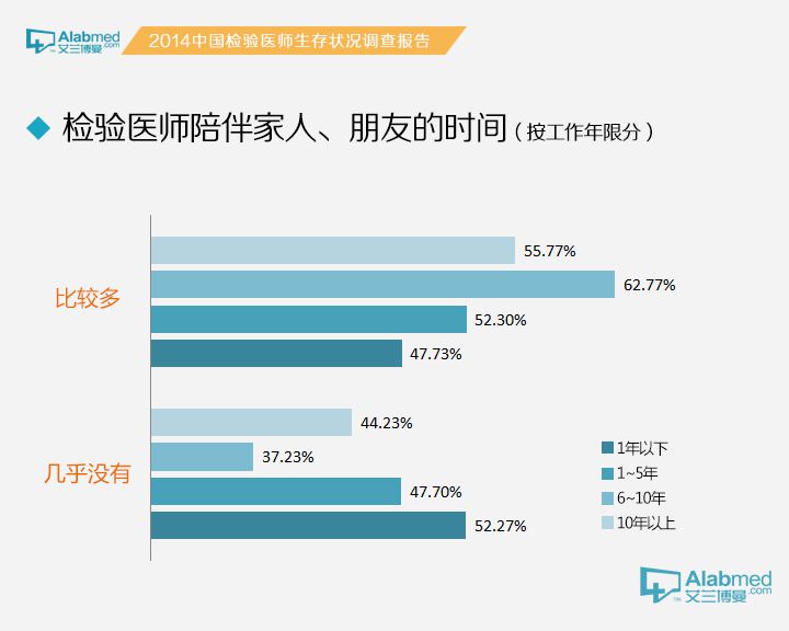 检验医生陪伴家人朋友的情况 相对而言,有较多时间陪伴家人、朋友的检验医生比几乎没有时间陪家人、朋友的检验医生少(分别为44.84%和55.16%),总体趋势呈现工作年限越长、职称越高,越没有时间陪伴家人、朋友。 陪伴家人、朋友时间较多(显著高于几乎没有时间)的情况仅出现在社区卫生服务中心/乡镇卫生服务中心/一级医院(57.41% vs 42.59%)、实习医生/实习技师(53.05% vs 46.95%)、博士及以上学历(57.14% vs 42.86%),以及工作年限1年以下(52.27% vs 47.73%)人群;而陪伴家人、朋友时间很少(极显著低于几乎没有时间)的情况出现在外企/合资医院(25.00% vs 75.00%)、三级医院(33.75% vs 66.25%)、硕士学历(29.09% vs 70.91%)、主任医师/主任技师(38.24% vs 61.76%)和副主任医师/副主任技师(37.10% vs 62.90%)人群。