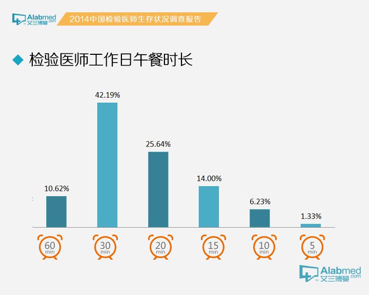 工作日午餐时间 工作日,2/3的检验医生花费20~30分钟吃午餐。
