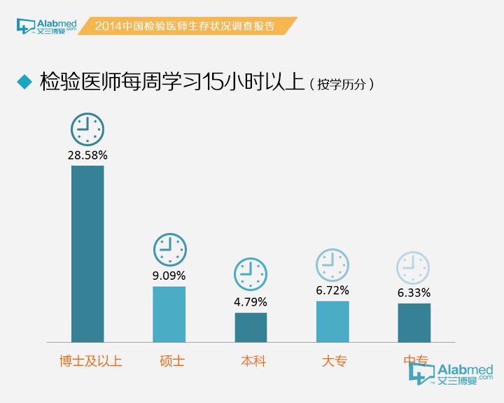 检验医生的学习情况 参与调查的检验医生中,每周学习时间小于3小时的占47.91%、4~7小时的占33.40%、8~14小时的占12.46%、15~21小时的占3.68%、21小时以上的占2.55%。 特别爱学习的检验医生包括外企/合资医院的医生(每周学习8小时以上的占50%)、副主任医师/副主任技师(35.49%)、工作年限1年以下的医生(30.69%),均远高于平均值(18.69%);最爱学习的检验医生是博士学历的检验医生,每周学习15小时以上的占28.58%,是平均值(6.23%)的4倍多。