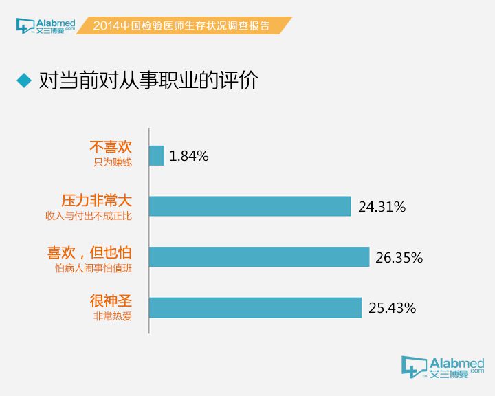 检验科医生的个人评价对所从事职业的评价 对于检验科医生对自己的职业评价,选择“很神圣、非常热爱”,“喜欢,但是也很怕,怕病人闹事,怕值夜班”和“压力非常大,收入与付出不成比例”的分别为25.43%,26.35%和24.21%,难分伯仲;认为“不喜欢,只是为赚钱”的只占1.84%。值得注意的是外企、合资医院的检验科医生认为检验工作“很神圣、非常热爱”的占到了50%,高居社区卫生服务中心/乡镇卫生服务中心/一级医院(28.70%),二级医院(17.89%),三级医院(25.62%),民营医院(27.43%)和独立医学实验室(35.62%)检验医生之首。