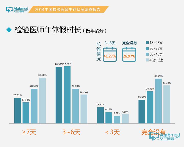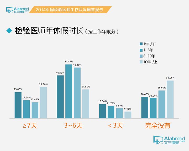 福利待遇情况年假休息时间 检验医生的年假可以休息多长时间呢?统计数据显示,41.27%的检验医生年假在3~6天,26.97%的检验医生在2014年完全没有休过年休假。而37.5%的45岁以上医生的年假≥7天,年龄段在18~25岁,26~35岁,36~45岁的医生年假在7天以上的分别为20.91%,17.38%和28.50%。45岁以上的检验医生7天以上年休假百分比为26~35岁检验医生7天以上年休假百分比的2.16倍;有趣的现象是,完全没有年休假的45岁以上的检验医生百分比为26~35岁检验医生百分比的1.18倍。上述数据与按照工作年限分类的结果类似。