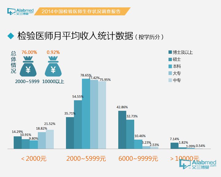2014年的月平均收入 对于大家最关心的检验医生2014年月平均收入,统计数据显示,76.00%的检验医生月平均收入在2000~5999元,仅有0.92%的检验医生月平均收入可以达到10,000以上。博士及以上学历的检验医生月收入在6000~9999元的占比42.86%,远高于学历为硕士(32.73%)、本科(10.46%)、大专(3.23%)、中专(2.53%)的检验医生。