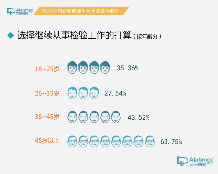 是否有不再继续从事检验工作的打算 对于是否有不再继续从事检验工作的打算,选择“很强烈,一定会离开的”占4.60%,选择“是,但是还在观望”占29.62%,选择“不知道,没想过这个问题”占30.03%,选择“没有,我会坚守这份职业”的占35.75%。按照年龄划分,年龄在45岁以上的检验医生,选择“没有,我会坚守这份职业”的高达63.75%,远高于18~25岁(35.36%),26~35岁(27.54%)和36~45岁(43.52%)年龄段检验医生。
