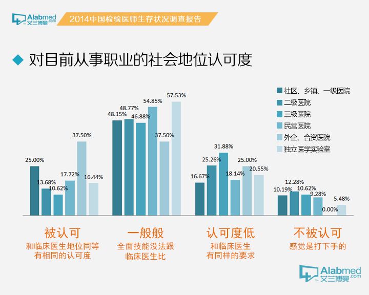 职业地位被认可度 对于检验科医生的职业地位被认可度,认为“一般般吧!全面技能没法跟临床医生比”的最高,占50.36%,认为“不被认可,感觉是打下手的”的占比最低,为10.21%。值得注意的是外资、合资医院检验科医生认为“被认可,和临床医生地位同等,有相同的认可度”的高达37.50%,明显高于社区卫生服务中心/乡镇卫生服务中心/一级医院(25.00%),二级医院(13.68%),三级医院(10.62%),民营医院(17.72%)和独立医学实验室(16.44%)的检验医生。