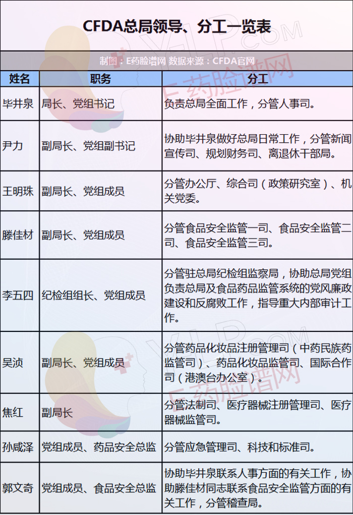 以下是脸谱君整理的CFDA总局领导最新职务、分工表。
