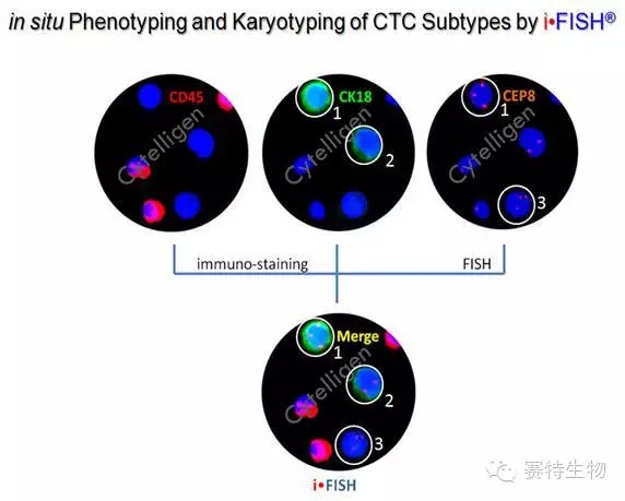 免疫荧光染色-FISH检测 (iFISH):染色体荧光原位杂交(FISH) 技术检测染色体数目异常的肿瘤细胞早已被人们广泛接受。但有别于常规的FISH方法,iFISH的技术原理是将免疫荧光染色与FISH进行了有效整合,在区分血源性与非血源性细胞的基础上,对CTC细胞同时进行染色体异倍体检测与任一瘤标表达的检测。相对于单一使用免疫荧光染色或FISH方法,iFISH可将染色体或瘤标异常的CTC有效检测出来,从而极大地提高了检测的灵敏性与特异性。此外,根据同一CTC上的瘤标表达与染色体数目,可将CTC进行亚类分型,每一不同亚类的CTC细胞在肿瘤的耐药、药敏、转移与复发等方面都有着不同的临床意义。赛特生物与北京肿瘤医院共同发表的最新临床实验结果提示,胃癌病人中的8号染色体3倍体CTC具有内源性耐药的特性,而4倍体或5倍体的CTC则可能具有继发性耐药的特性 (Li etal, 2014, Oncotarget 5:6594)。该发现为医生今后制定更为合理的肿瘤个体化治疗方案提供了更可靠的依据。