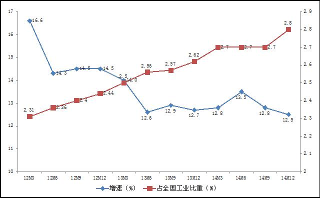 2012-2014年医药工业增加值累计增速与占比 对比2013年公布的数值,2014年规模以上医药工业增加值同比增长12.5%,增速较去年下降0.2个百分点,高于工业整体增速4.2个百分点,在各工业大类中位居前列。医药工业增加值在整体工业所占比重达到2.8%,较上年增长0.18个百分点,显示医药工业对工业经济增长的贡献进一步加大。分季度看,2014年各季度末累计增速分别为12.8%、13.5%、12.8%、12.5%,下半年增速呈现下降。