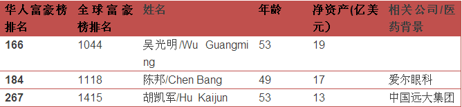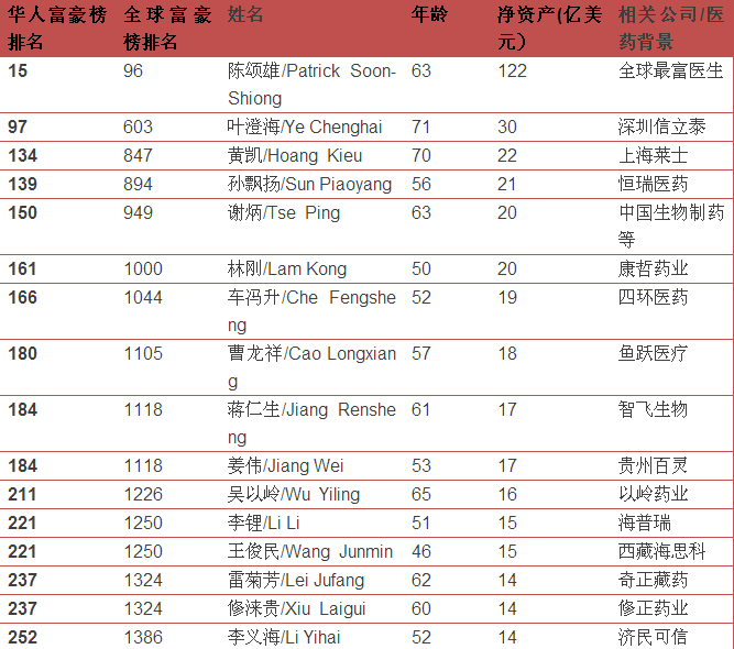 《福布斯》杂志中文版今天发布了2015华人富豪榜,阿里巴巴董事局主席马云、腾讯公司董事局主席兼CEO马化腾、百度CEO李彦宏进入榜单前10名。 其中制药与生物科技领域的富豪有24人,医疗保健设备与服务领域的富豪有3人。究竟他们是谁呢? 以下为医药观察家网根据榜单整理出来的上榜的医药圈富豪们: 2015福布斯华人富豪榜 制药与生物科技领域:24人