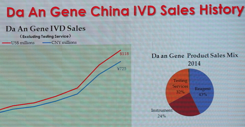 在中国的体外诊断公司中,他以达安基因作为实例,分析了达安基因在2014年的增速情况和销售额占比,其7.25亿的体外诊断收入中,诊断服务占比32%,试剂占43%,仪器占24%。并表示,尽管国际竞争形势非常严峻,但中国体外诊断市场仍在快速发展,预计将在未来的10~15年内超过美国,成为世界上最大的体外诊断市场。 全球体外诊断呈现的趋势及体外诊断公司领导者 1、免疫诊断(主要为化学发光免疫诊断)取代生化诊断成为市场主流; 2、体外诊断向两个方向发展:高效率、自动化的一体化诊断;POCT检测; 3、个体化临床诊断越发受到重视。