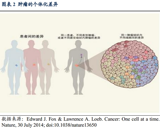 图表1展示的是直肠癌产生过程相关基因突变累及的过程,直肠癌的产生是不同的抑癌基因和原癌基因突变累积的结果。 人以群分,肿瘤以基因突变分 肿瘤存在着很大的异质性,不同患者即使拥有同一类型的肿瘤,但是导至其发病的肿瘤细胞内基因突变可能相差甚远,因此肿瘤内的癌细胞也很大可能会有功能的异质性(图表 2)。