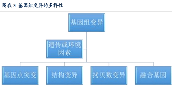 仅以非小细胞肺癌为例,目前发现约 25%的患者含有基因 KRAS 的突变,而其它患者还有不同的导至该疾病的常见驱动基因突变,包括编码表皮生长因子受体(EGFR)、间变性淋巴瘤激酶(ALK)和 V -RAF 鼠肉瘤病毒原癌基因同源体 B1(BRAF)的基因,表皮生长因子受体 2(HER2)等。 基因组上变异的复杂性导至了肿瘤的异质性,肿瘤基因组上的变异有多种形式。基因组上的变异来源分为遗传性的突变以及由于环境因素导至的体细胞突变,主要有四种类型(图表 3)。