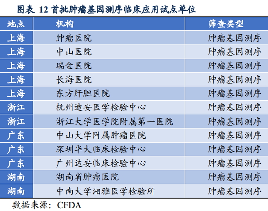 国家卫生计生委医政医管局于 2015 年 3 月终于发布了第一批肿瘤诊断与治疗项目高通量基因测序技术临床试点单位名单。其中,杭州迪安医学检验中心、深圳华大临床检验中心、广州达安临床检测中心以及中南大学湘雅医学检验所作为第三方检验所也位于榜单之中,对于获批的这些公司将具有明显的先发优势。 肿瘤测序的先发优势相较于无创产前筛查会显得更加明显。首先,肿瘤领域的基因测序是精准医疗最重要的组成部分,其应用将覆盖肿瘤的易感基因检测,早期筛查,疾病确诊,个性化用药指导,随诊与疗效评价等众多治疗环节;其次,肿瘤作为人类寿命的头号威胁其发病率和消费刚性远超产筛市场;同时,肿瘤诊断的高通量测序相对于无创产前筛查,其数据解读难度更大,而且基因突变和肿瘤关系的个性化解读需要有足够多的样本数据支持。 肿瘤测序市场细分领域渐露雏形 肿瘤测序市场应用领域根据对癌症指导时间点可以大致分为四种,包括癌症的超早期筛查,化疗靶向药物指导,癌症预后的监控、最后的风险评估以及基因治疗指导。癌症超早期基因筛查已于 2014 年陆续进入市场,随着大公司样本数据的积累以及价格的下降(目前普遍都在上万元以上),该应用会越来越多地得到认可;化疗用药指导的应用最为成熟,市场竞争比较激烈;肿瘤愈后监控呈现出刚需的市场前景,但还须获得医院的认可;肿瘤基因治疗一直处于研究阶段,世界范围内均未实现突破,商业化路途较为遥远。 测序服务下游应用市场超百亿美元:据 BCC 预测,测序服务将从 2011 年不超过 10 亿美元增长到 2016 年 35 亿美元,复合增长率为 29%。根据 Illumina 的预估,基因测序服务市场容量有 200 亿美元,其中,肿瘤学 120 亿美元、生命科学 50 亿美元(包括生命科学工具、复杂病症,农业基因以及影响因子和宏基因组)、生育和基因健康 20 亿美元(孕妇和新生儿童的检测,以及基因健康)、其他应用 10 亿美元。现阶段,国内测序的临床服务在产前检测方面应用较多,而肿瘤基因测序市场则还处于待开垦状态。 在肿瘤测序服务商业模式分析方面,分析师认为,美国 CLIA 认证下的肿瘤测序服务规定了临床诊断实验室操作的规范,实验结果的准确性、可靠性;国内肿瘤测序服务商业模式多元:大多数中小企业还是依赖于上游供应商,销售模式包括与医疗机构,药企等的合作;第三方检测与医院投放并行。 投资总结与展望 政策开闸,有利于先发者;生物信息学分析或成为瓶颈;更好、 更多的测序仪决定了测序的质量和数据产量,肿瘤诊断易感基因设计是核心,同时更多的样本数据累积和生物信息分析能力对于提高公司竞争力也尤为重要。 最后,分析师建议上市公司中,重点关注达安基因(002030),迪安诊断(300244),其次关注北陆药业(300016,持有世和基因 20%股权),新开源(300109,收购晶能生物100%股权,后者目前从事高通量测序服务),丽珠集团(000513,持有美国CYNVENIO 公司 13.64%股权)。 备注:本文观点为东吴证券分析师报告。