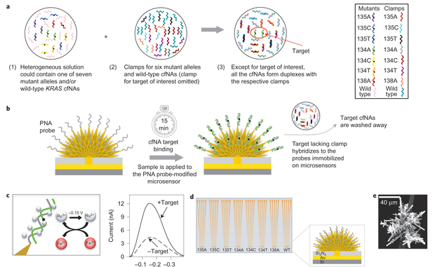 加拿大多伦多大学的科学家Shana Kelley、Edward Sargent及其团队描述了一种“电化学钳测定法”来分析实验室和临床病人的cfNAs样本。该测定方法将“钳PCR”的策略与电化学传感器相结合,以获得对目标cfNAs的高度选择性。 在此之前,“钳PCR”技术已在实验室中被用于DNA突变检测。传统的PCR,难以区分并选择性扩增含有突变型和野生型的DNA样品中的低频突变。钳PCR引入肽核酸(PNA)“钳”,有利于突变DNA的选择性扩增。不过这种方法不太适合独立检测临床样品,如病人的血清,部分原因是由于背景杂质也会显著扩增,影响结果的准确性。 在这篇文章中,应用这种技术的典型装置是一种具有纳米结构的微电极,在其上连接与目标核酸序列互补的PNA探针,比如针对Kirsten大鼠肉瘤-2病毒(KRAS,与很多种癌症都相关)的基因。 接着,将这种传感器用于测量样品在电催化由Ru(NH3)63+和Fe(CN)63-组成的氧化还原对的反应电化学信号。首先使用无任何核酸分析物的样品作为对照样品。再将含有突变基因目标序列,结合非目标序列,以及各种非互补的突变体,还有野生型核酸的“钳”序列混合在一起。在该混合物中,“钳”序列与非互补核酸结合,只留下目标序列与微电极的PNA探针结合。最后,该传感器的电信号被再次测量,得到与对照样品信号的差异,以灵敏测量突变基因的存在。 电化学钳测定法中最引人注目的方面是它能够直接快速地在未经处理的临床样品中检测与肿瘤相关的突变cfNAs。在原理性实验中,微电极上可以连接不止一种PNA序列,可以设计多种探针与不同肿瘤关联的KRAS突变序列互补。这种方法确保了传感器可以检测几种不同的可能突变位点。这种传感器被用来直接检测来自肺癌患者的含有低浓度突变序列的血清样品。结果显示,即使样品没有经过任何前处理过程,这种电化学钳测定法也能够正确地把癌症患者的相关阳性突变与健康人或其他癌症患者的样本区分开来。 总体而言,此方法在血清样本检测中的表现令人印象深刻。该技术在cfNAs的检测方面有很多优势:首先,使用合理设计的PNA钳保证了高度的特异性;第二,仅需要少量物质和小体积样品(50微升)就可以进行分析;第三,灵敏度高,具有1飞克每微升的RNA检测下限;最后,该分析可以在短短5-15分钟产生结果。由于这些特点以及其可用于未经预处理样品,电化学钳测定法有望替代目前用于癌症诊断的传统DNA测序和PCR技术。 不过,这种方法在临床常规使用之前还有一些潜在的挑战,比如,所述测定需要精心设计的PNA钳序列的集合;在未纯化的血清(≤~2 nA的)中的电化学信号的变化幅度都比较小;传感器的制造和附带的质量控制需要的光刻和电化学技术的组合。