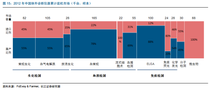 既然在试剂上面的国产化无法避免被国外企业卡住生产原料的话,在仪器上面的情况又是如何的呢?2012年,国产生化检测仪器市场占有率已经超过了进口仪器。免疫诊断的仪器还处在国产替代进口的过程中,但是势头很猛,仅2012年免疫诊断中相对高端的化学发光仪器的市场占有率也达到了54%。