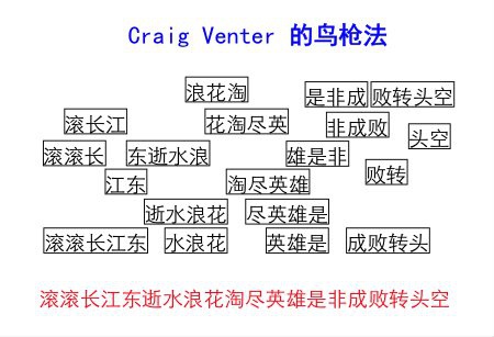 Craig Venter的一大科学贡献是把人类的基因库组装起来,他发明的方法是很有意思的“鸟枪法”。比如说我要知道《三国演义》这本书里文字的序列,但是我能得到的只是打碎的一行一行的片段。Venter的方法是找很多本《三国演义》,然后打碎成一行一行的,由于是随机的,所以每行的断裂都不一样,然后把得到的千千万万碎片上下重叠起来,就可以得到《三国演义》中原始的文字序列(见下图)。当时没有人觉得这个方法可行,而Venter坚信可以由此得到百分之八、九十的人类基因序列,虽然不是100%,但已经很了不起了。