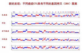 我们同时也看到拷贝数的变化。正常体细胞里的基因拷贝数是2,癌细胞要高于或低于2。实验发现同一个肺癌病人的8个循环肿瘤细胞表现出高度一致的拷贝数变异模式。更有趣的是,不同病人的同种癌的基因拷贝数图案也是一样的,这就展现了一个好的前景。我们可以通过分析循环肿瘤细胞拷贝数图案来推测癌症类型。最近我们跟张宁教授合作,又发现乳腺癌、肺癌、前列腺癌、结肠癌和胃癌具有不同的基因拷贝图案(如下图)。所以,现在我们想利用这些发现做不需活检的无创癌症检查,希望能多收集一些循环肿瘤细胞,这样也许能够做到癌症的早发现。