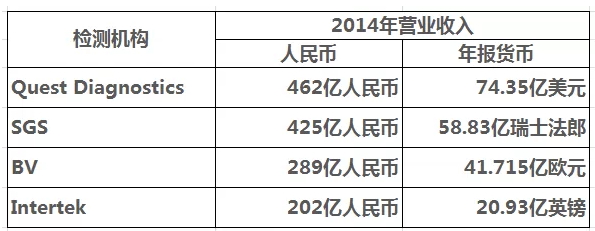 奎斯特诊断公司(Quest Diagnostics )是世界领先的临床诊断公司,拥有世界上领先的医疗和科研人员约900名,大多数都是医学博士和博士。它发起于1967年,期间经历多次并购,1990年在美国特拉华州更名成立,1996年在美国纽交所上市。目前它在美国拥有31个区域性大型诊断中心,155家快速反应实验室,超过2100个病人服务中心,每年诊断超过1亿个标本。 早在2012年,Quest Diagnostics 的营业收入就超过SGS公司,达到465亿元人民币。尽管分子诊断行业的竞争越来越激烈,但是在去年,Quest Diagnostics 的2014年全年营业收入依旧为74.35亿美元,约合人民币462亿元,比2013年增长4.0%;且公司在年报中表示,预计2015年营收将增长2%~3%。