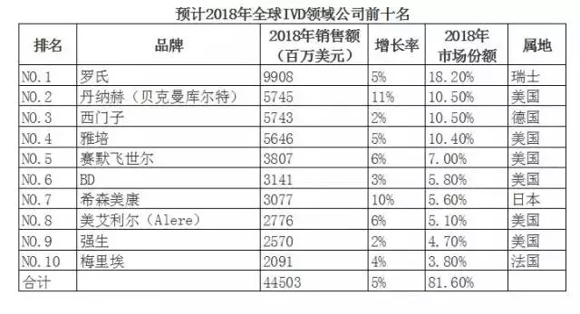 数据统计显示:到2018年,这十家巨头企业年总销售额将达到445亿美元,平均增长率为5%。销售总额合计占到整个市场份额的81.6%,占比相比2011年统计数据上升了4个百分点。 1.数据解读 市场潜力无限,发展势头迅猛的IVD行业目前在中国医疗器械行业内是最具发展活力的子行业,但其所处的国际竞争却是异常激烈,从上述表格数据可以看出: 一是:全球十大IVD巨头企业中欧美占九席之多,而美国独占六席 全球十大巨头企业中美国有六家;德国一家;法国一家;瑞士一家;日本一家。基本都是在经济和制造业强大的国家。而相比中国IVD企业,这十家巨头企业还都有着较长的发展历史与产品、市场积淀,在行业内属于技术领先型、产品全面型企业,在市场竞争中占据着十分明显的先发优势。 二是:十大企业市场占比逐渐增大,市场垄断进一步加深 依托其先进的技术和全面的产品以及品牌的传承,十大巨头企业在抢占市场先机方面占据先机,同时通过收购兼并等手段不断扩大自身,独霸世界市场。2011年数据显示十家企业的总销售额占比为77.6%,而预计将以5%的平均增长率发展,到2018年期总销售额占比将进一步攀升到81.6%,十家企业占据整个市场的八成之多——整个IVD市场将进入垄断时代。 三是: “一超多强”局面 排名首位的罗氏,凭借着近100亿美元的销售额占据着全球近两成的市场份额,显示出罗氏在IVD领域强大的统治力;丹纳赫(贝克曼库尔特)、西门子、雅培以占据市场份额10%左右成为继罗氏之后的三强,余下六家企业分场份额分别在一成以内。 2.国产IVD产业分析 目前国内IVD企业虽然在数量、规模以及技术上有着巨大的成长,市场占据率也有了长足的进步,但进口IVD试剂依然在国内市场,尤其是三甲医院等占据着较大市场。国产品牌依然面临着激烈的竞争。 国产IVD企业众多,但在规模上没有形成可以和十大巨头相当的体量;虽然有的企业在技术上达到甚至领先国外巨头企业,但其在产品丰富度上相差甚远、在品牌树立及推广上也无法和其相比。 尽管国内IVD领域很热,技术、资本流入都很大,但企业大多依然处于“小打小闹”阶段,无法集聚成规模;在品牌树立方面,国内尚且知名度不高,在国际上更是没法和这些巨头企业相抗。 现实的差距就是国产IVD企业错过了黄金发展的先发优势,而如何最大化发挥后发优势就成了业内人最关心的问题。 在掌握有先进技术的前提下,如何组建其一家产品丰富体量较大的有竞争力的公司,这需要政策、资本、技术、人才等多方位的资源配合,或许在影像界异军突起的联影会给IVD领域一些启发。总之,国产IVD产业发展还有很长一段路要走。 |