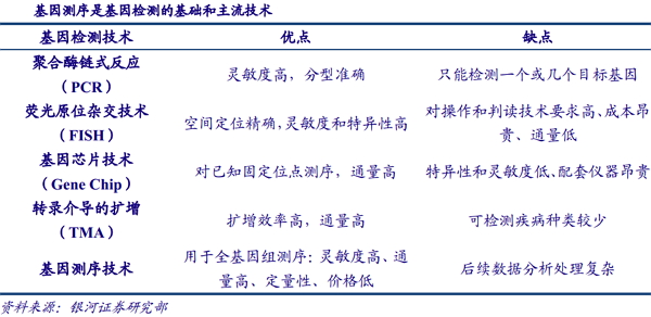 3、基因测序是基因检测的基础和主流技术 基因检测技术,应用分子生物学的方法检测患者体内遗传物质的结构或表达水平的变化,以实现精准诊断,从而指导更优的治疗方案。目前基因检测常见手段包括聚合酶链式反应 (PCR)、荧光原位杂交技术(FISH)、基因芯片技术(Gene Chip)、转录介导的扩增(TMA)和基因测序技术等,其中基因测序是其他四种检测方法的基础和主流技术。