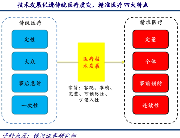近日,银河证券历时两个多月,对基因测序行业龙头企业华大基因、贝瑞和康和达安基因相关上市公司进行了全方位调研,对行业政策环境,技术趋势及行业巨头的商业模式和投资逻辑进行了深入全面的分析,深入研究基因测序全产业链,梳理了 23andMe、Illumina、罗氏和谷歌的商业模式变革,并发布了《基因测序的发展趋势与商业模式——探讨精准医疗系列报告之(一)》的深度调研报告。研报指出,短期关注获取基因组样本和临床数据能力强的公司,长期内关注发展三四代测序技术的公司。 基因测序是精准医疗的基础,具广阔应用和增长空间 随着人类基因组测序技术的飞速提升、生物医学分析技术的快速发展和大数据分析工具的日益完善,我们正进入全新的医疗健康时代——精准医疗。 精准医疗是一种基于“个人”的定制医疗模式,其以个体的组学信息和遗传信息为基础,以环境、生活方式、既往病史及诊疗方式等为跟踪对象,搜集全方位、可量化、有前瞻性和时效性的个体数据,通过数据的综合分析、挖掘形成有价值的医学信息,最终设计出针对个体的最优解决方案。基因测序为个体提供连续基因大数据,是精准医疗的基础和重要实现途径,制药、器械、IT 等行业巨头纷纷布局该领域。 基因测序技术凭借灵敏度高、精度和通量高、价格低廉等优势,成为基因检测技术中获取人体基因组数据的主流技术,通过将基因组数据与无线生物传感器获取的生命体征信息(如血压、心跳、脑电波、体温等),成像设备中的个体信息(如 CT、MRI、超声等)以及传统医学数据相结合,精准医疗为个体提供全新的定制医疗。 (一)“一刀切”治疗时代已过时,启动精准医疗刻不容缓