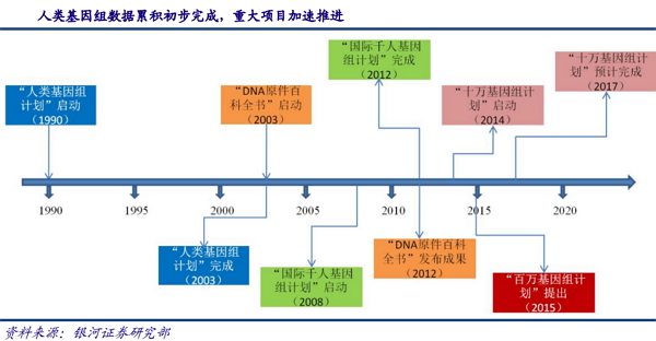 (三)供需两端共同驱使基因测序飞速发展 1、测序成本和测序耗时成指数级下降 测序的成本和耗时呈指数级下降。 随着二代测序技术 (Next Generation Sequencing, NGS)的不断革新,测定一个人全基因组数据的成本,由原来的上亿美金,快速下降到目前 1000 美元,测序时间也降至 3 天。 2、人类基因组大数据累积初级阶段完成 经过 10 多年的累积,人体基因组数据库已经初步形成规模。 2003 年,由美中等 6 国科学家历时 13 年、耗资 30 亿美金的“人类基因组计划” (Human Genome Project) 宣布完成。同年,“DNA 元件百科全书计划”启动,并于 2012 年公开发表研究成果,对人类疾病相关的基因序列研究有重大影响。随后,“国际千人基因组计划”、英国“十万基因组计划”、美国“百万基因组计划”先后于 2008 年、 2014 年和 2015 年启动,为人类基因组样本的累积和探究疾病与基因的关系提供了扎实的基础。