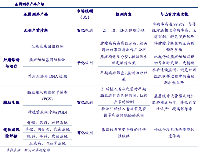 医疗领域可分为人体基因组和人体微生物基因组两个子领域。针对人体基因组的主要产品有肿瘤学(诊断筛查与治疗、靶向用药、伴随诊断等)、生育(无创产前诊断、胚胎植入前检测、新生儿遗传病排查、亲子鉴定等)、遗传学疾病和新药研发指导等。目前人体微生物基因组与宿主健康的关系也已被重视,如 2007 年和 2008 年,美国国立卫生研究院(NIH)和欧盟先后启动了人体微生物组计划(HMP)和人体肠道宏基因组计划(MetaHIT),可通过分析人体微生物基因组检测宿主的肠道疾病、神经系统疾病、肝病、糖尿病、肥胖以及腹腔肿瘤等。 在非医疗领域中,可以通过环境微生物基因组研究治理环境污染的新方法、探测石油存储和地质学研究,也可以用于农牧业配种和司法鉴定等。本篇报告主要讨论基因测序在医疗领域中针对人体基因组的应用。 (一)欧美公司垄断测序仪器与耗材市场 1、二代测序是目前主流测序技术,Illumina 占最大市场份额 测序技术是测序仪器的核心所在,迄今为止已历经四代发展。其中主要的是前三代测序技术: 第一代测序技术,即 Sanger 测序技术;第二代测序技术是当今主流技术,主要有 Illumina公司的 Solexa 和 HiSeq 技术, Life Tech 公司的 Solid 技术和 Roche 的 454 技术;第三代 Pacific Biosciences 公司的 SMRT 测序技术。第四代测序技术正向着测序仪器体积更小的方向发展,如 Oxford Nanopore Technologies 公司的 MinIon 纳米孔单分子测序技术。 主要公司有 Illumina, Life Tech (被 Thermo Scientific 以 136 亿美元收购)和 Roche。其中 Illumina凭借其超高通量和相对较长读长的优势,占有超过 70%的市场份额。 2、三四代测序技术 10 年内凭借超长序列读长取代二代测序技术 我们预计 10 年后二代测序技术会被三、四代测序技术所取代。各代测序均有不足之处,一代测序的主要缺陷是低通量和高成本,二代的缺陷是序列长度较短,三四代测序在准确率方面有严重缺陷。由于 NGS 技术面临的短序列缺陷可以通过生物信息学工具在一定程度上进行弥补,因此二代测序技术是现今最稳定,应用范围最广泛的测序技术。但目前科学家正在通过减缓 DNA 序列通过纳米孔速度的方式提高第三代测序的准确度,相关成果已发表在《Nature》子刊。我们预计 10 年内三、四代测序的准确度将会显著提升,届时将在保证测序通量的基础上,凭借着超长序列读长的优势取代二代测序。 基因测序全产业链划分为上游的测序仪器与试剂耗材市场,中游的基因测序服务市场和下游的生物信息学分析市场。中下游市场面向群体包括医院、药厂、科研机构以及消费者等,可分为医疗和非医疗两个领域。 (二)基因测序服务市场百家争鸣,积极向上下游延伸 目前全球有上千家厂商提供测序服务,中国有超过 200 家。美国拥有全世界最多得测序仪,中国测序仪数量不超过 500 台。随着市场对测序的需求不断提升,中游市场提供测序服务的对象包括医院、疾控中心、科研机构等,提供包括用于无创产前诊断、肿瘤诊断与治疗、遗传学诊断以及辅助生殖等相关的基因测序服务。 我国测序服务提供商积极地向产业链上游延伸。国内在测序仪器市场的开发策略分为两类: (1)第一类是通过与国外仪器生产商合作,买断产品在国内的全部权利。如贝瑞和康与Illumina 合作生产的新型测序仪、华大基因收购美国基因测序仪公司 Complete Genomics 后基于该平台开发 BGISEQ1000 测序仪、达安基因与 Life Tech 合作的 DA8600 测序仪。这种模式虽然使用国外的仪器技术,但通过国内的仪器设备通道申报 CFDA,申报和审批相对较快。 (2)第二类是自主研发模式,如紫鑫药业与中科院基因组所合作的自主研发的二代测序仪器已于2014 年 4 月 18 日发布,数据产出量与 Roche 454 相当。 中下游市场结合非常紧密,测序服务公司往往会提供有偿的生物信息学分析服务。美国大型的测序服务公司有:Sequenom, CardioDx 和 Foundation Medicine 等,国内的主流测序服务公司有华大基因、诺禾致源、贝瑞和康、达安基因以及北陆药业等。不同公司根据提供服务的内容有所区分。 二代测序技术凭借通量大、精度高、价格相对低廉等优势,已成为目前主流测序技术。 由于专利保护力度大和技术门槛高,二代测序仪器制造市场壁垒较高,已被欧美公司垄断。 (三)下游数据解读能力需进一步发展 人体基因组共有 23 对染色体,包含超过 30 亿个碱基,而目前仅有 3%能从临床给予解释。由测序服务公司提供的原始序列文件在经过系统地分析处理前,无法提供任何有效的信息。 数据有效分析的三要素包括高性能计算平台、专业的分析软件和高质量的大样本数据库。计算平台用于对测序仪器得出的原始序列文件进行质量剔除、序列匹配等一系列分析的基础工作,分析软件和大样本数据库用于遗传解读和咨询。据 Ebiotrade 调查,69%的被调查人员认为数据的分析解读是影响测序产业链发展最大的瓶颈。 数据分析的有效性将决定下游市场公司的核心竞争力。目前全球有超过 100 家生物信息公司提供基因数据分析服务,成熟的高通量测序技术产生了海量数据,生物信息学分析市场涵盖数据压缩存储、工作平台、数据分析软件等。现阶段生物信息学技术可以对基因组学数据进行初级分析,主要集中在分析人体基因组的 SNP 和 Indel 检测,而分析 SV 和 CNV 则受限于样本量较少和 NGS 测序技术的局限性,无法使