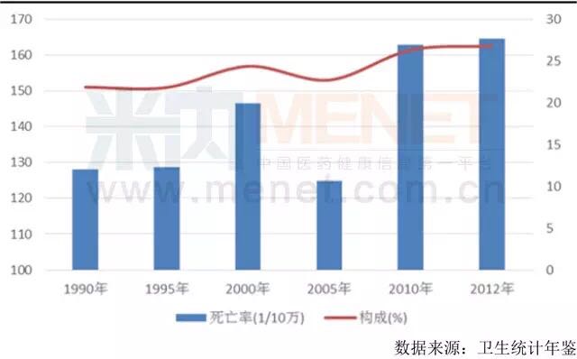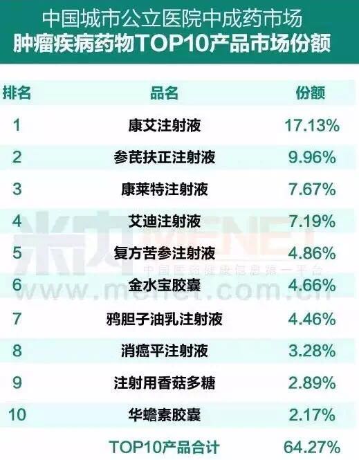 近年来随着我国人口的老龄化、工业化带来的环境污染和城市化等因素带来的生活习惯改变,我国居民的肿瘤患病率和死亡率出现明显提高,目前恶性肿瘤已经超过心脑血管疾病,成为我国居民的头号杀手,占我国死亡比例25%以上。 全国肿瘤登记中心发布的《2015年中国肿瘤登记年报》显示,我国2011年新增癌症病例337.2万,癌症死亡病率221.3万,全国恶性肿瘤发病率为250.28/10万(男性277.77/10万,女性221.37/10万),中标率为186.34/10万。相当于每分钟就有6.4个人得癌。 在刚性需求、新药研发上市难及我国医疗保障体系不断完善的推动下,国内抗癌药市场发展快速。 国内抗肿瘤药物市场格局