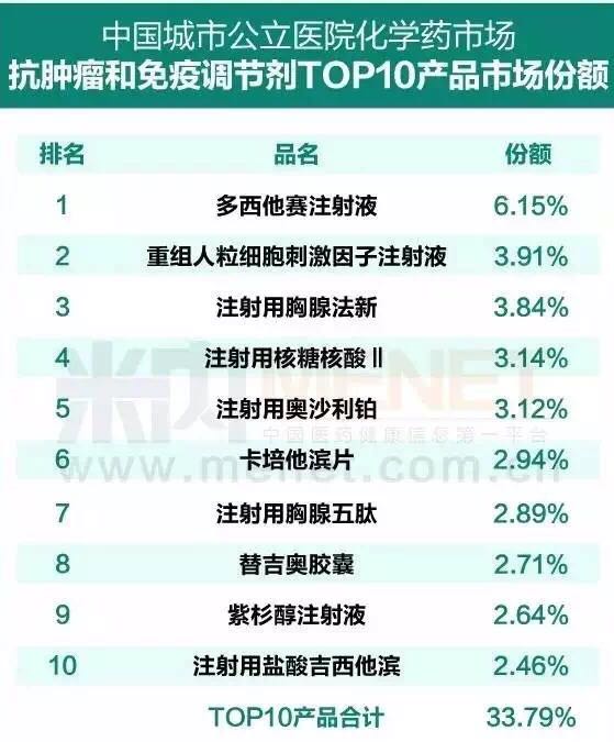 2014年,进入国内样本医院前10位的抗肿瘤药和免疫调节剂产品各5个,涉及的抗肿瘤药分别为:植物药2个,紫杉醇用药金额13.9亿元,增长率为15.1%,多西他赛10.3亿元,增长率下降0.8%;抗代谢药2个,培美曲塞9.9亿元,替吉奥7.1亿元,增长率分别为20.1%和21.4%;烷化剂1个,奥沙利铂7.2亿元,增长率为5.6%;涉及的免疫刺激剂有5个,胸腺五肽13.2亿元、胸腺肽α19.7亿元、人血丙种球蛋白7.8亿元、康艾7.8亿元、重组人粒细胞集落刺激因子7.1亿元,增长率分别为9.5%、10.4%、23.6%、14.4%和0.7%. 国内抗肿瘤药市场上表现突出的产品是培美曲塞和替吉奥;免疫调节剂表现突出产品为人血丙种球蛋白、康艾。其中,康艾为中药大品种。从样本医院数据来看,国内抗肿瘤药物市场仍以植物碱和抗代谢类药物为代表的细胞毒类药物为主流,小分子靶向药物则增长迅速。 据国内22个城市样本医院数据,2014年,排名前10位企业用药金额为80.2亿元,占据国内抗肿瘤药和免疫调节剂用药市场三成以上份额。排名前5位企业分别是:江苏恒瑞医药用药金额11.3亿元、山东齐鲁制药用药金额10.7亿元、上海罗氏制药用药金额10.6亿元、江苏南京思科药业用药金额9.5亿元、诺华公司8.5亿元,国内表现较为突出的企业有诺华、江苏豪森药业、江苏南京思科药业、山东齐鲁制药。 豪森的产品布局攻略 中国抗肿瘤药物研发虽然一度落后,但在药品价格调整、医改启动及大病医保扩容等因素的影响下,很多本土企业都开始把研发抗肿瘤用药作为未来企业发展的重点,涌现出恒瑞、齐鲁、豪森等抗肿瘤领域的领军企业。这次我们以豪森为例,来分析一下在抗肿瘤领域的产品布局策略。