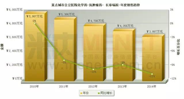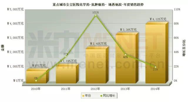 昕维(甲磺酸伊马替尼片) 伊马替尼是瑞士诺华研发的酪氨酸激酶抑制剂。2001年5月10日,伊马替尼以“具有突破性的抗肿瘤机制”获得FDA的特快审批,商品名为Gleevec(格列卫)。最初用于α-干扰素给药失败胚细胞危象病期、慢性病期、加速病期的粒细胞白血病(慢性骨髓血癌)治疗用药。随后,FDA又批准伊马替尼用于胃肠道间质细胞瘤的治疗。经过全球广泛的临床使用后,倍受热捧。 随着伊马替尼在全球跑马圈地,诺华已然赚得盆满钵盈。2013年,伊马替尼全球销售额为46.93亿美元,比上一年增长0.39%,在全球抗肿瘤化药市场居第一位。伊马替尼2002年进入中国市场。2013年专利到期后,仿制药纷纷上市。截至2014年10月,已有3家国内企业生产的伊马替尼原料药及口服制剂获批上市,分别是江苏豪森药业股份的“昕维”、正大天晴药业集团股份的“格泥可”和石药集团的伊马替尼片剂。 据米内网数据,2013年,国内16个重点城市样本医院伊马替尼用药金额为2.7亿元,比上年增长了24.73%。国产药上市后,打破了原研药的垄断地位,也使药品价格大幅下降,仅为原研药的10%左右,从而激发了潜在市场需求。随着医保大门的打开以及国产药的上市,预计今后两年,伊马替尼市场将会呈现量增价降的趋势。