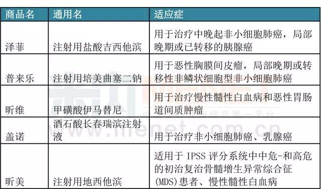 昕美(注射用地西他滨) 地西他滨分别于2006年4月和5月由欧洲EMEA和美国食品药品管理局批准上市,由MGI Pharma公司开发,英文商品名为Dacogen,英文通用名为decitabine,为注射剂,适用于IPSS评分系统中中危-和高危的初治复治骨髓增生异常综合征(MDS)患者、慢性髓性白血病。 目前国内已有豪森、正大天晴、齐鲁、奥赛康等多家企业的地西他滨仿制药上市,但原研药仍然占据主要市场。