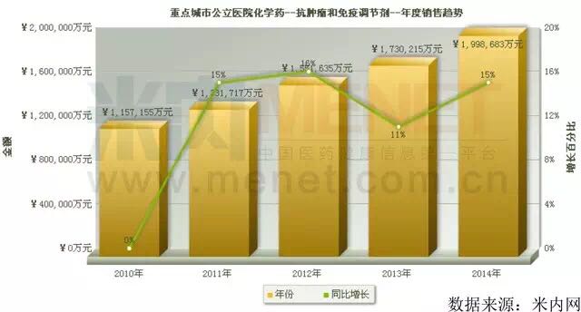 据米内网数据,国内抗肿瘤药和免疫调节剂市场规模从2005年的48.7亿元增长到2014年的248.4亿元。其中,2007~2012年增长率均保持在20%以上,连续五年保持较快的增长速度;2013~2014年,抗肿瘤药和免疫调节剂市场有所放缓。2005~2013年,抗肿瘤药和免疫调节剂购药金额复合增长率为20.0%,9年整体市场增长5.1倍,高于国内整体市场增长率。随着癌症发病率不断提高,抗肿瘤药和免疫调节剂已经成为样本医院购药金额排名第一位的药物。