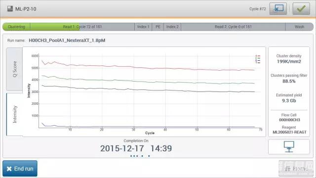 作者:Allison Yunghans,公共卫生硕士,研究助理,Illumina核心应用组 如今,全世界都知道了Illumina的新款测序仪——MiniSeq,它是专为那些需要简单实惠、但功能强大的靶向测序方案的研究人员而设计的。不过,我试用这个小仪器已有几个月的时间,当时我加入了Illumina核心应用组。我的背景是普通生物学和公共卫生,尽管我曾经在科研和工业实验室担任研究助理,但我对新一代测序(NGS)没有任何经验。虽然掌握对工作很关键的技术和应用还存在挑战,但我能相对轻松地安排实验并运行。从指导运行设置到数据分析的功能,自始至终,MiniSeq都在为我这样的NGS新手用户而考虑。 我的职责之一是支持Illumina的文库制备产品,包括TruSeq? Targeted RNA,一种对几十至几千个基因同时进行表达谱分析的扩增子方法。在文库制备之后,我将在MiSeq?上测序我的文库,并在BaseSpace?上分析数据,MiSeq是近几年Illumina主力的桌上型测序系统。尽管MiSeq系统是用户友好的,但是当我开始使用MiniSeq时,我还是惊讶地发现了更多简单和有用的功能,它们来自MiSeq和NextSeq?系统的最佳创意组合。MiniSeq流动槽是干燥包装的,这节省了MiSeq流动槽因为液态运输所需的准备时间。MiniSeq一体化试剂盒的设计节省了实验所需的时间和空间。MiniSeq的进一步改进包括,试剂盒是全包的,含有全部洗涤液,因此不需要在每次运行时购买和识别不同的缓冲液和部件。同时,MiniSeq是Illumina台式测序系统中占地面积最小的,只有18 x 19英寸,将更多实验室台面上空间留给其他任务。 MiniSeq运行所需的设置时间极少;最终的文库准备只需要不到10分钟。仪器设置简单至极,屏幕上一步一步的动画指引我完成上样试剂盒和流动槽的过程。经过一些系统检查,仪器就可以开始运行了。MiniSeq在大约24小时内即可完成2 x 150 bp的测序运行,使得计划第二天下一次运行更加容易。仪器还显示了运行大约在什么时候完成。 图1:运行过程中MiniSeq控制软件的截屏,它显示了预计的完成时间。