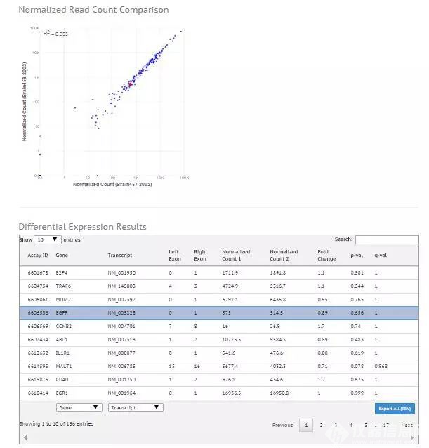 我喜欢在设置界面剪切和粘贴文库和样品信息,或导入简单模板这样的功能。Local Run Manager运行模板还可以让你选择分析的选项。在设置运行并完成后,Local Run Manager将自动开展分析,并生成报告,总结运行的测序结果。 图中显示了一些结果,是利用Local Run Manager Targeted RNA流程分析我的Targeted RNA文库所产生的。同样,这一切都在MiniSeq仪器上完成– 不需要大型计算机系统或连接到云端。对于那些不使用云计算的实验室,或作为生物信息学家开展更广泛分析之前的第一轮自动分析,这的确是一个很大的好处。 图3:Local Run Manager中显示的TruSeq Targeted RNA结果。曲线和表格显示了人脑参考RNA(HBRR)的两个技术重复之间的基因表达计数数据。表格中选中的EGFR基因突出显示了散点图中的特定数据点(红色)。