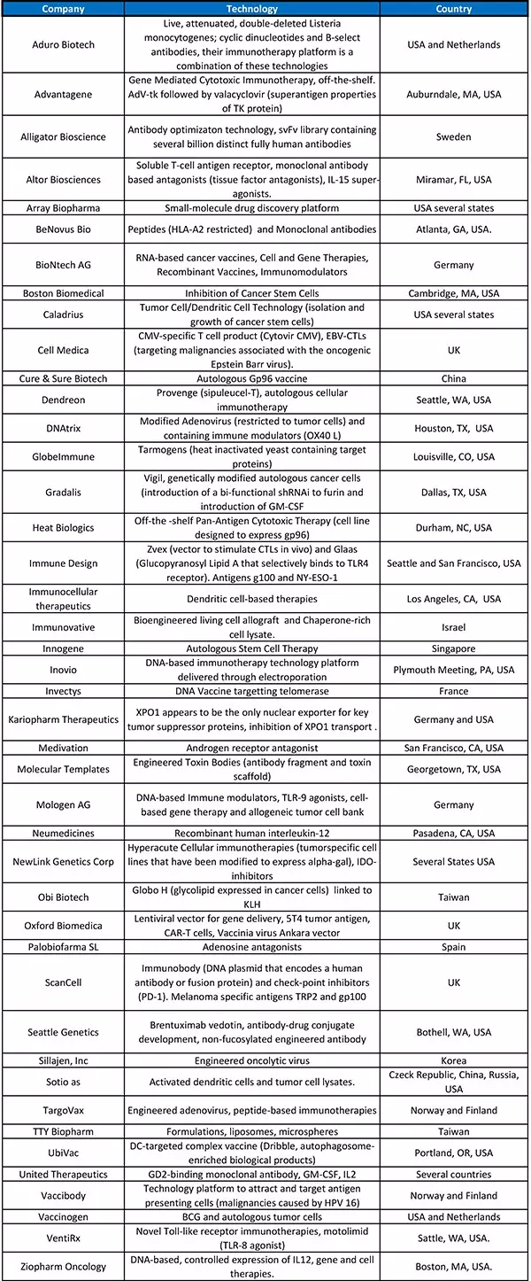 图为正在开展癌症免疫治疗研发的公司及技术 对临床试验各种的分析表明,同种细胞因子在不同癌症患者中会引起大相径庭的免疫应答。正如业内学者预料的那样,越来越多的科研机构倾向于使用细胞治疗技术进行临床研究。在应用性研究中,科学家则倾向于将各种细胞因子与有的效化疗方法和肿瘤抗体相结合。 同时,大好的癌症免疫疗法市场行情也催生了诸如肿瘤治疗新型生物材料、电穿孔设备、基因治疗、光动力治疗、生物标志物鉴定等诸多跨学科技术的发展。接下来的十年中,全球癌症患者定会因为这些技术的发展而受益无穷。 ??除了技术因素之外,强大的专利体系也对肿瘤免疫领域的发展起着重要的作用。随着业务的发展和新型癌症疗法获得营销授权,领先于同行在全球范围内获得各国的授权也成为主流技术公司扩展业务的主要内容。过热的癌症免疫疗法市场专利框架不仅复杂而且充满着不确定性,随着各个公司专利技术的授权,整个行业的专利体系也显得变化万千。 朱诺与诺华关于CAR T细胞技术的专利诉讼仅仅只是创新公司间纠纷的开始,行业的战场逐日开辟,很快就会有好几个玩家持有不同癌症免疫疗法的关键专利。 举个例子,2015年12月德国生物制药公司Apogenix新药APG101获得了美国专利局的直接授权。作为细胞外CD95受体Fc域与IgG域的完全人类融合蛋白,APG101对于多种癌症有着良好的疗效。APG101的专利授权在业内引起了广泛的关注,也使得Apogenix正式成为逐鹿于癌症免疫疗法市场的一员。目前,APG101正在实体肿瘤(胶质母细胞瘤)和恶性血液疾病的治疗领域开展着临床实验。 根据已有的报道和市场信息,我们预计2016年将有更多的癌症免疫疗法专利覆盖全球。 尽管很多人认为免疫系统并不会对抑制肿瘤生长起到太大作用,现实的研究结果确实证实了免疫系统在肿瘤治疗过程中的巨大作用,不论手术、化疗还是放疗,免疫系统都在其中起着极大的积极作用。在不久的将来,癌症免疫疗法可能会与其他多种癌症疗法形成多种联合治疗手段,为癌症患者带来最大的福利。虽然现有的癌症治疗方式看起来仍然是“一切照旧”,但是我们相信在手术、化疗、放疗以及免疫疗法的痛苦过程之后,作为健康的检验员,免疫系统将行之有效地完成它的工作,使得治疗后能够拥有更好生活质量的癌症患者持续增多。