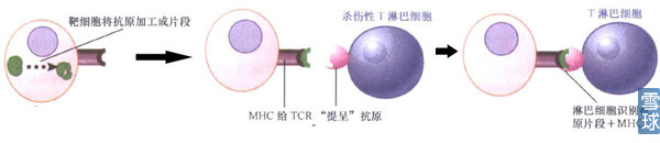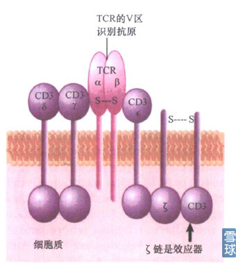 这一部分涉及三个方面:TCR,MHC,抗原加工呈递。 TCR,即T细胞表面受体,TCR与CD3蛋白复合体结合从而发挥作用。当与CD3相连的受体同抗原结合并被激活时,CD3就可参与信号从细胞表面到内部的转导。TCR可变区和抗原的相互作用会引发CD3复合体的ζ亚基激活T淋巴细胞应答。 TCR-CD3复合体: