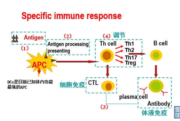 过程:抗原的识别——APC抗原加工与呈递——特异性免疫 细胞免疫由细胞毒性T细胞(CTL)介导(即我们通常理解的T细胞,还有一类是辅助性T细胞,即上图中的Th cell,参与体液免疫)。 T细胞的活化需要共刺激信号