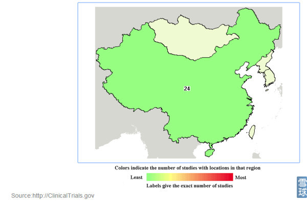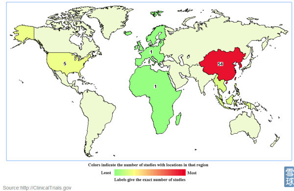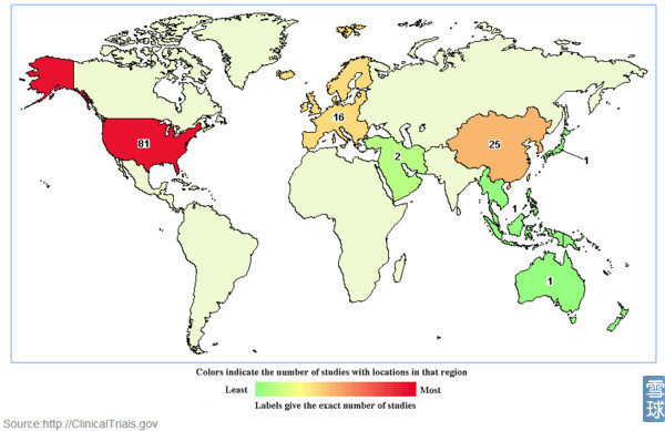 截止到2016年1月10日全球范围内进行的CAR-T约125项(受关键字影响不一定准确)。美国最多(81项),其次是中国(24项)。