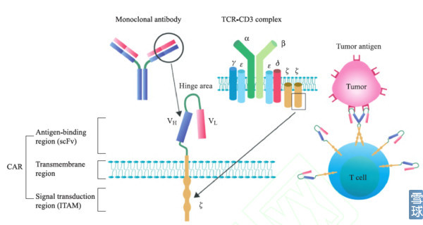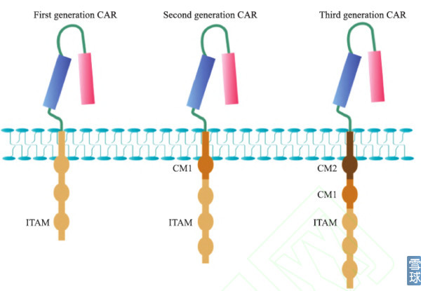 典型的CAR由胞外抗原结合区、跨膜区域和胞内信号转导区组成。其中抗原结合区由来源于单克隆抗体的轻链 (vl) 和重链 (vh) 组成, 中间由带韧性的铰链区连接形成单链抗体 (single chain fragment variable. scfv)。CAR结构里的第一个关键部位是识别肿瘤抗原的单链抗体,它能识别肿瘤特异性抗原,即所说的靶点,比如识别CD19,EGFR等,而不是需要加工递呈出来的抗原多肽,因此这样的结构解决了两大问题:靶向性问题和绕开抗原递呈的问题,肿瘤患者就算把HLA丢失或抗原递呈能力下调也没关系。 细胞内信号转到区主要为免疫受体酪氨酸活化基序(immunoreceptor tyrosine-based activation motifs, ITAM, 通常为CD3ζ或FcεRIγ)以及共刺激信号,用的最多的为CD3ζ也是天然的TCR活化序列,共刺激信号使得CAR-T细胞在体内存活时间非常长。 几代CAR-T的区别在于细胞内信号转到区连入了不同的正向共刺激信号: