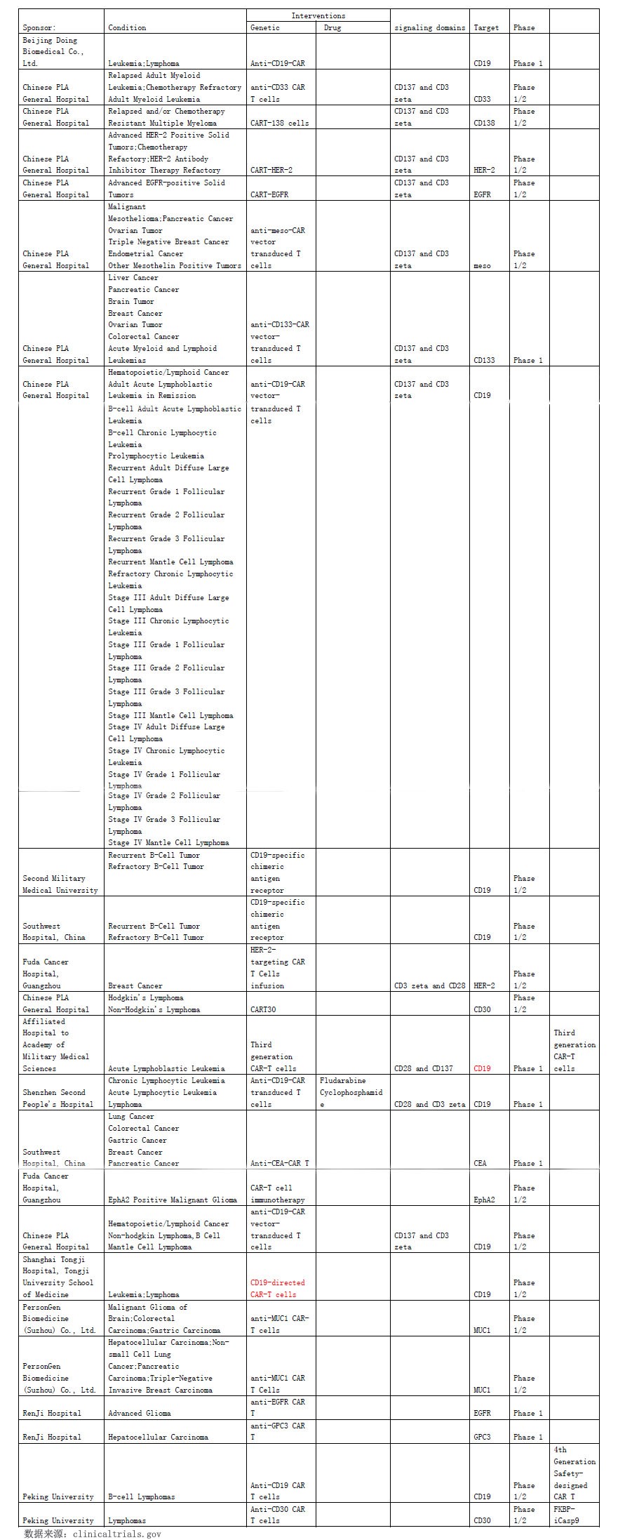 中国CAR-T临床试验登记列表: