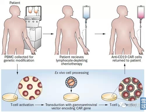 1. 是靶向/非肿瘤 理想的目标抗原只在肿瘤细胞表达并且对肿瘤细胞的存活有重要意义。但目前已知的肿瘤特异性抗原(tumor specific antigen, TSA)较少, 除了少数CAR-T试验针对前列腺特异性膜抗原(PSMA)和表皮生长因子受体Ⅲ(,EGFRvⅢ)等TSA外, 大多数针对重要组织不表达或相对可损耗组织表达的肿瘤相关抗原(tumor associated antigen, TAA),不幸的是表达的大多数TAA不具备肿瘤细胞限制性,从而导至“是靶向/非肿瘤”毒性的产生。 以目前应用广泛CD19靶点为例,这种抗原不但表达于所有正常的B细胞表面也表达于多数恶性增殖的B细胞表面。由于CD19在造血干细胞中不表达,使用抗CD19的CAR-T细胞进行治疗,其毒性也被限制于B细胞再生障碍性贫血,可通过补充丙种球蛋白来轻松处置,因此这种“是靶向/非肿瘤”毒性在治疗B细胞再生障碍性贫血中是可以忍受的。 在实体瘤中“是靶向/非肿瘤”毒性远非B细胞再生性贫血障碍那么简单。实体肿瘤上,CAR很可能因为没有归巢到肿瘤位置,而和靶点表达较少的正常细胞结合,杀死正常细胞,产生致命危险。一个结肠性转移的患者在接受消耗性化疗接连ERBB2靶向的T细胞过继5天后死亡。推测是由于肺部聚积了大量的改造的T细胞,它们识别肺上皮少量表达的ERBB2后引起了促炎症细胞因子的大量释放。促炎症细胞因子的释放引起了肺部毒性、多器官衰竭,进而导至病人的死亡。用表达CAIX的第一代CAR治疗肾细胞癌时,11例病人中有5例被报道发现了肝脏毒性。总结病因是改造后的靶向型T细胞可以识别胆管上皮低水平表达的CAIX。 上述研究凸显了在相同时期与正常组织相区别的特异性靶向抗原的重要性。 目前的办法有:寻找肿瘤特异性更强的抗原,如神经胶质瘤中的EGFRvIII;设计的改进和T细胞的抗体识别区域亲和力,以较低的亲和性识别抗原高表达的肿瘤细胞, 而不攻击相同抗原低表达的正常细胞;双功能的CAR,其策略主要是让1 个T 细胞表达2 个不同的CAR,即使其中一个CAR 的抗原在正常组织中有少量表达,也可通过另一个CAR 来提高T 细胞的特异性。;自杀开关(如北京大学两项研究,引入iCasp9自杀基因)。 2. 炎症因子风暴 促炎症细胞因子的增多是一个过继后T细胞功能的标志。CLL(慢性淋巴细胞性白血病)病人外周血和骨髓中的促炎症细胞因子的增多与CAR改造T细胞的扩增协同出现。携有较大残留病灶负荷的患者接受CAR-T治疗产生严重细胞因子释放综合征的风险更高。细胞因子释放综合征(CRS)没有标准治疗方式,目前用类固醇进行处置,或最近使用的IL-6单克隆抗体tocilizumab来处置。 3. 难规模化 CAR-T的制备流程: